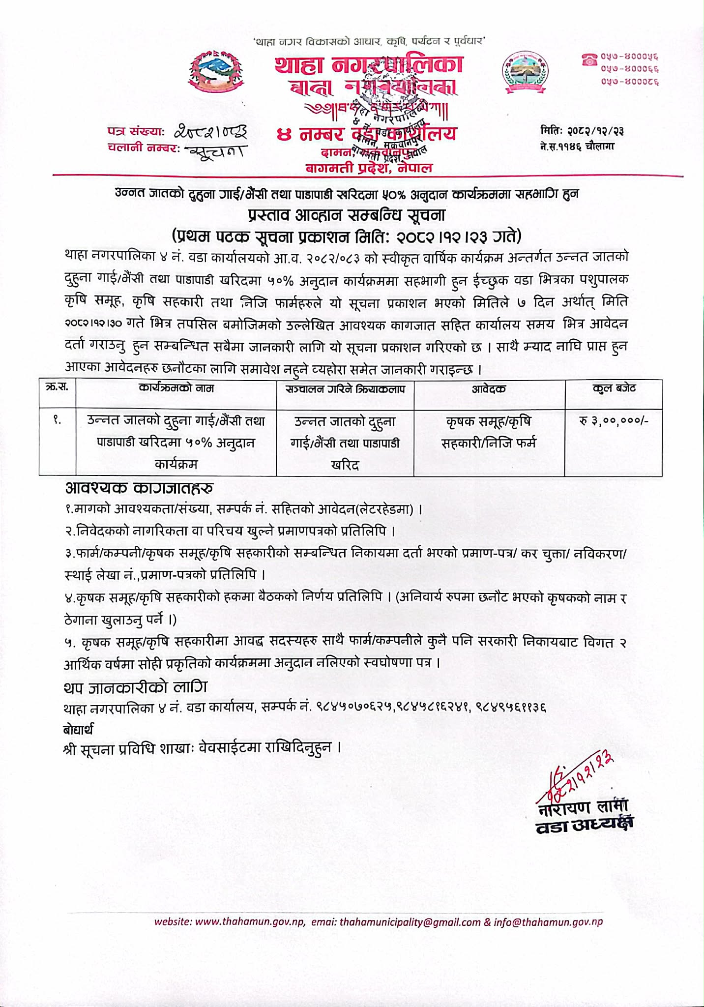 उन्नत जातको दुहुना गाई/भैसी तथा पाडापाडी खरिदमा ५० प्रतिशत अनुदान कार्यक्रममा सहभागी हुन प्रस्ताव आव्हान सम्बन्धी सूचना !