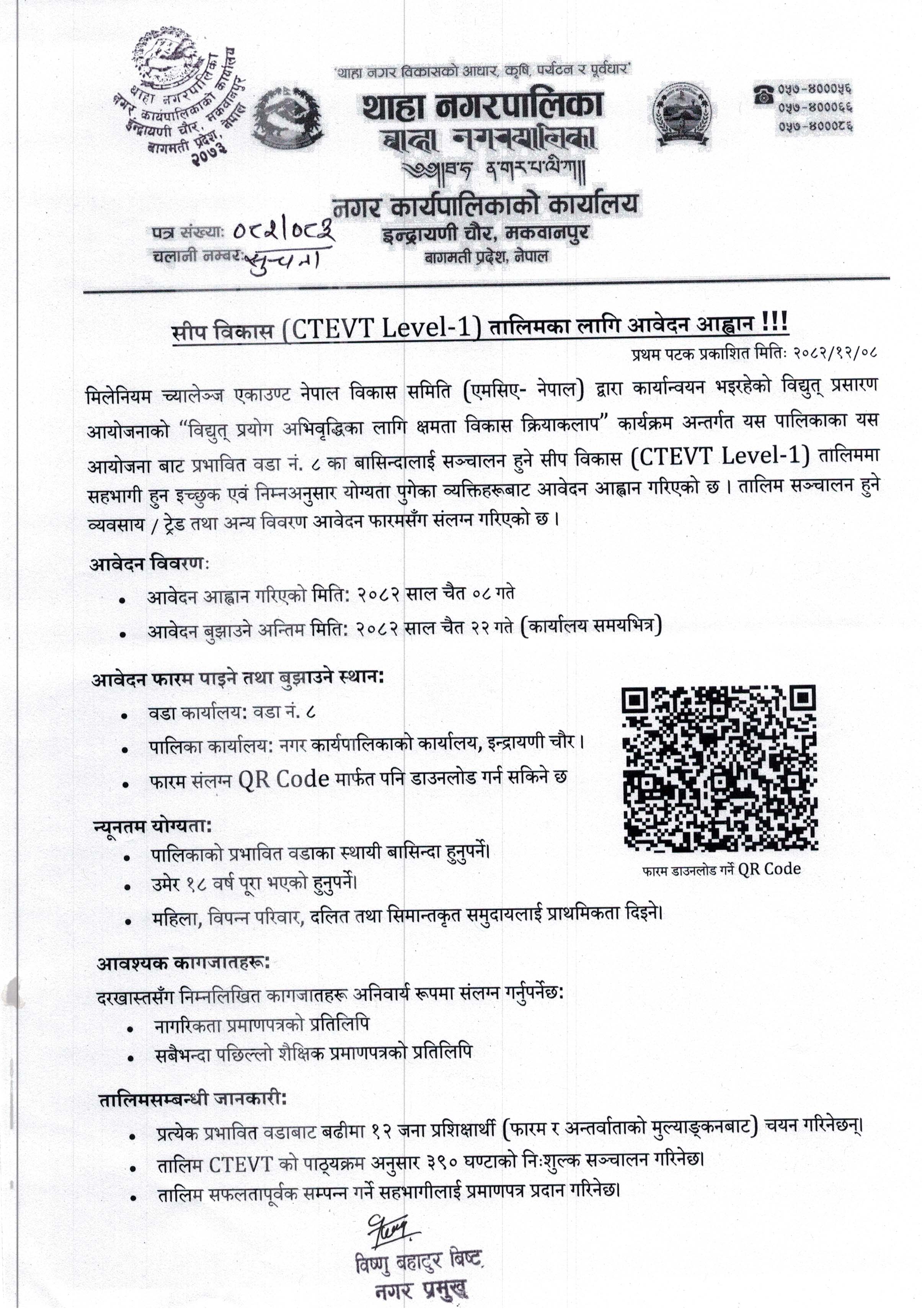 सीप विकास (CTEVT Level-1) तालिमका लागि आवेदन आव्हान सम्बन्धी सूचना !