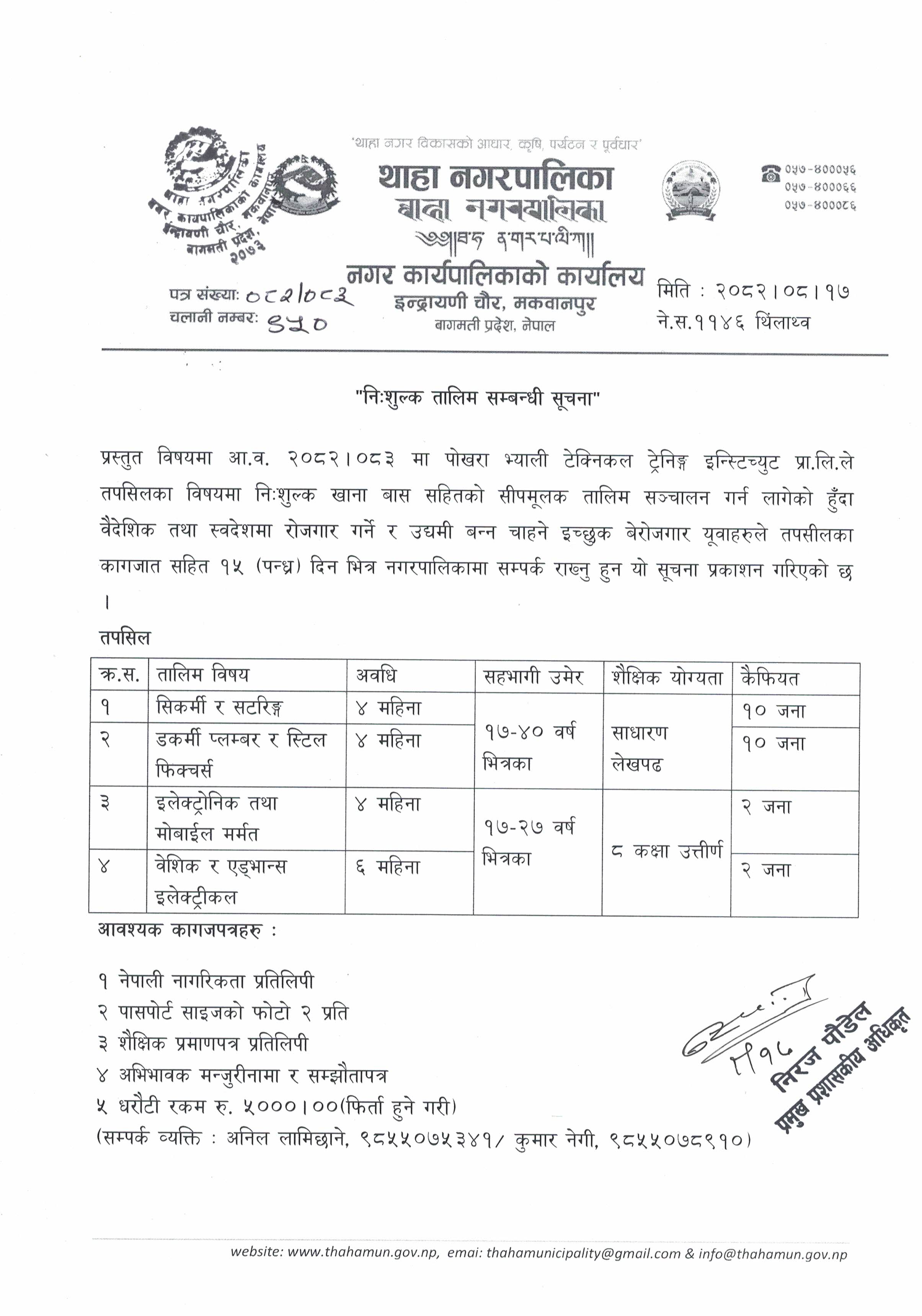 नि:शुल्क तालिम सम्बन्धी सूचना !!!!
