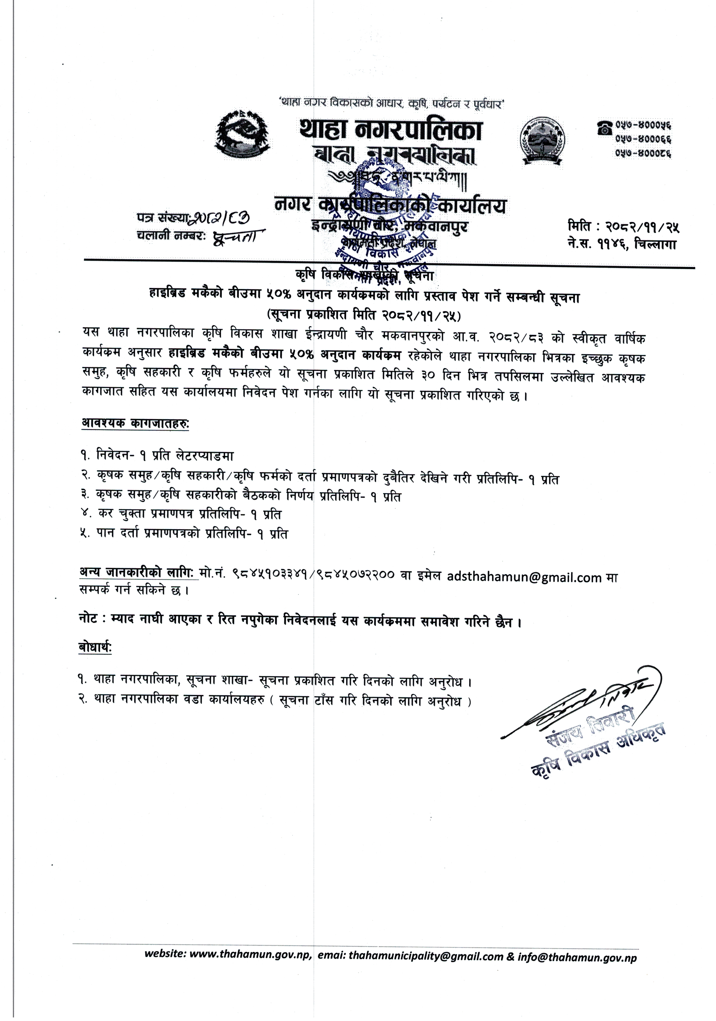 थाहानगरमा ५० प्रतिशत अनुदानमा कृषि सामाग्री (हेर्नुहोस् सूचना)